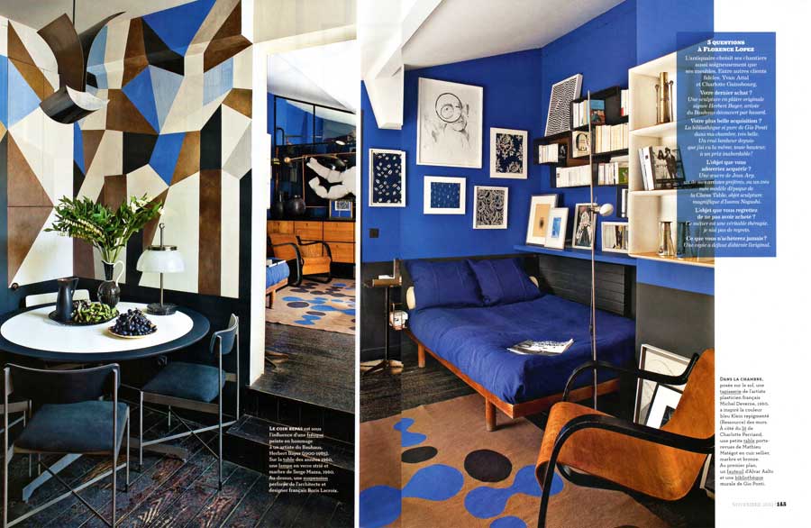 A côté du lit Charlotte Perriand, une petite table porte revue de Mathieu Mategot.